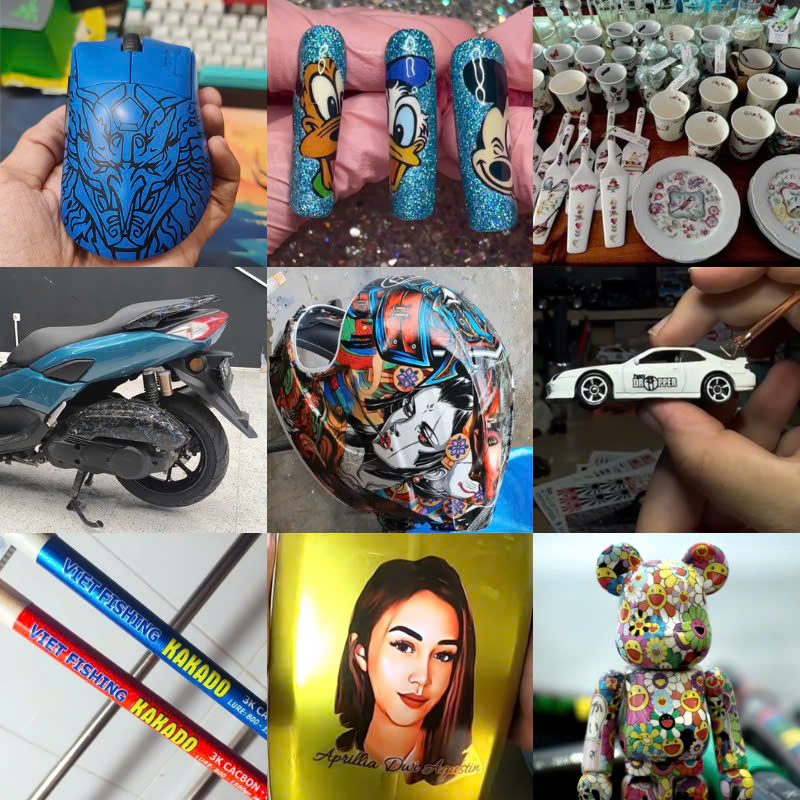- Decal trượt nước có độ co giãn tốt, có thể in lên các sản phẩm không phải mặt phẳng ví dụ như nón bảo hiểm, ly cốc, bình uống trà, bình giữ nhiệt, chậu hoa....