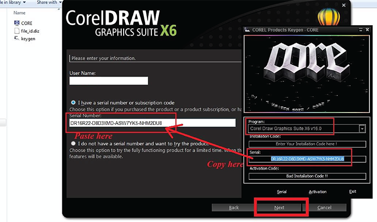 Bước 6: Bạn hãy copy serial number từ phần mềm keygen dán sang phần mềm. Và sau đó nhấn Next