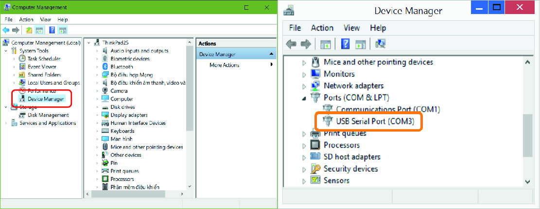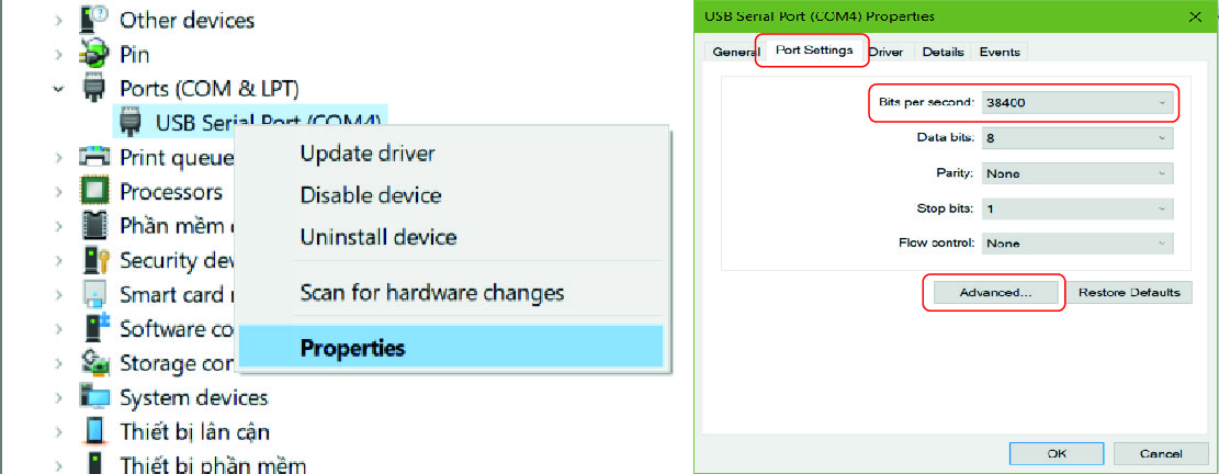 Tìm tới dòng "Ports (COM & LPT)" Click chuột phải vào "USB Serial Port (COM3)" rồi thiết lập thông số như ảnh bên dưới.