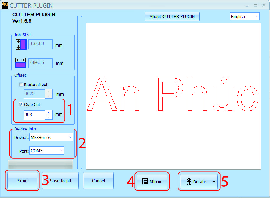 - 1 Over Cut: khi bạn chọn thông số này nghĩa là máy cắt sẽ cắt xuyên qua điểm đầu tiên dao bổ xuống decal một khoảng cách là 0.3mm. Thông số này bạn chọn tùy theo nhu cầu của mình.