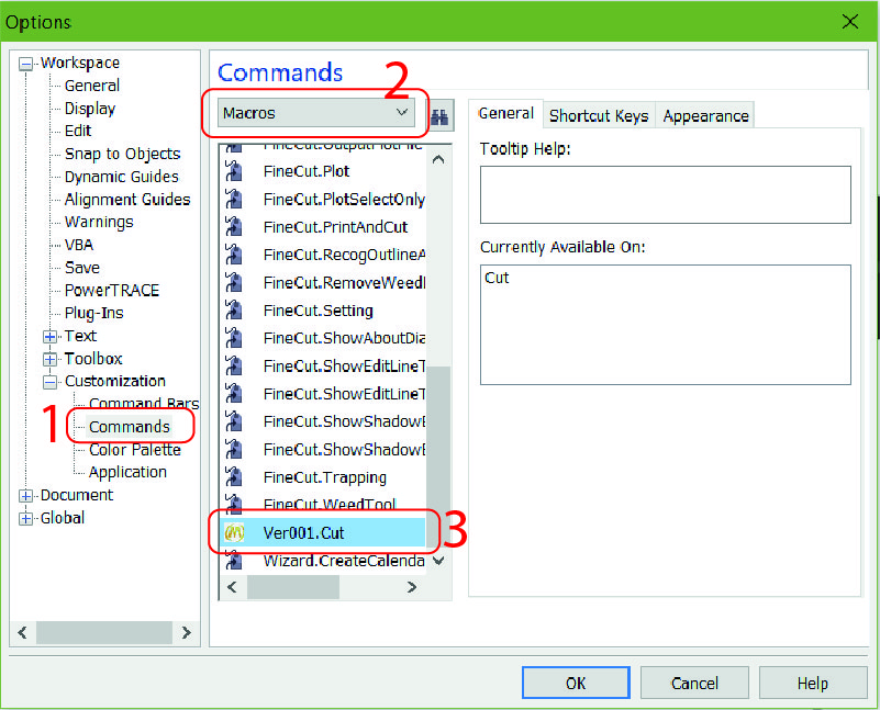 Với một số corel đời thấp như 12, sau khi cài đặt xong sẽ không hiện ra icon để bấm lệnh cắt, ta sẽ phải lấy ra gắn lên thanh menu của Corel. Cách làm như sau, trong Corel các bạn bấm vào "Tool --> Customization..." sẽ hiện ra 1 bảng như hình. Bạn chọn theo thứ tự 1,2,3 tìm đến biểu tượng "Ver001.Cut" bấm và giữ vào biểu tượng đó rồi kéo thả lên thanh menu của Corel sau đó bấm OK là được.