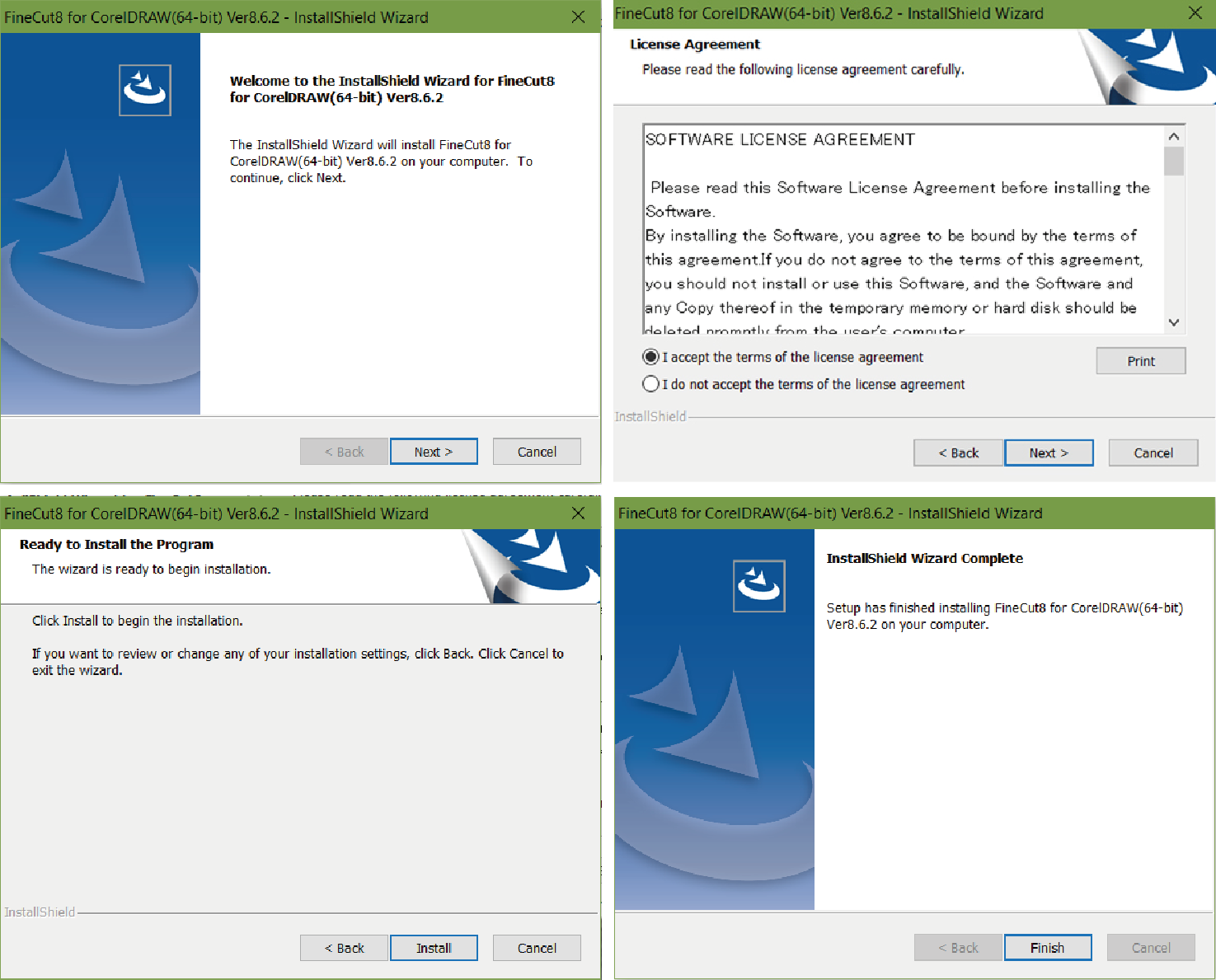 Mở thư mục "FineCut8 for CorelDRAW" tùy vào Corel của bạn là bản 32bit hay 64bit mà bạn mở tiếp vào folder đó rồi chạy file "FineCutInstaller_x...exe" Toàn bộ quá trình cài đặt tương đối đơn giản, chủ yếu là bấm chọn các biểu tượng "Next --> Install --> Finish" như ảnh bên dưới.