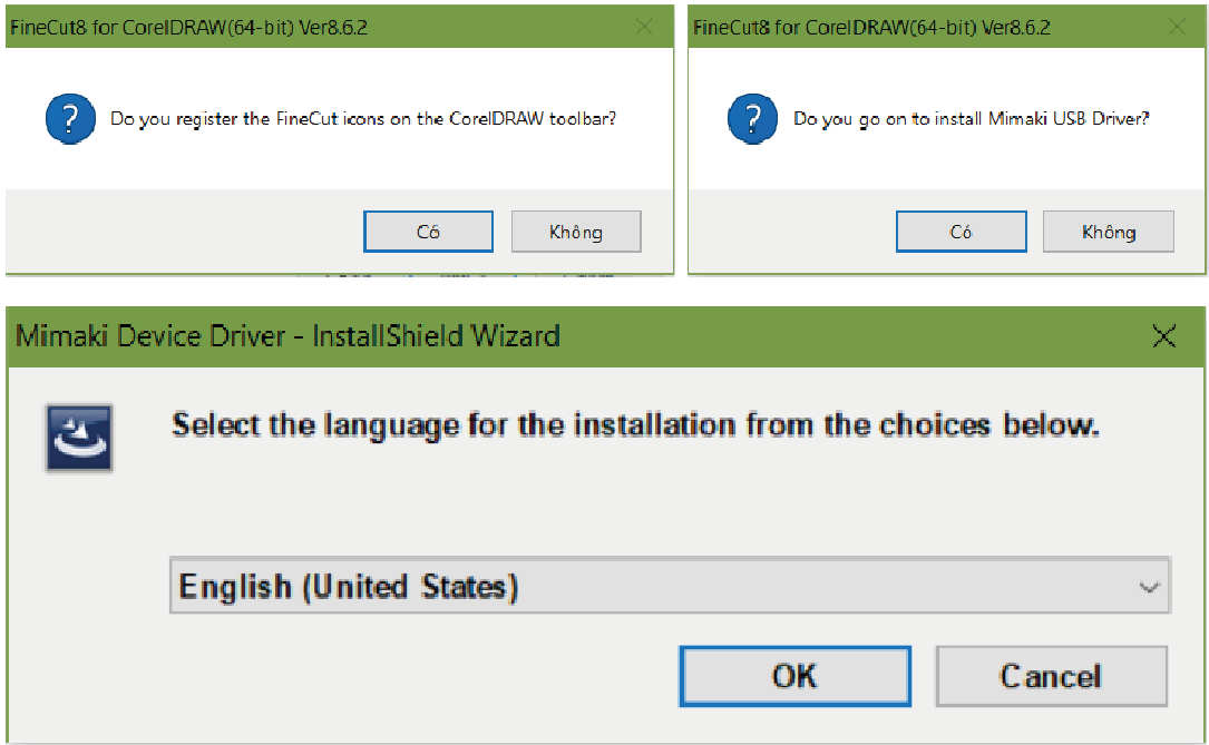 Tiếp theo chọn "Yes" để cài tool tích hợp vào phần mềm Corel và chọn "Yes" lần nữa để cài driver cho máy cắt như ảnh bên dưới.