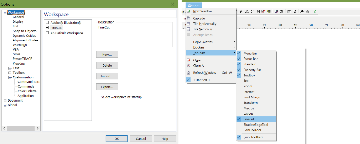 Trong trường hợp Corel ko hiển thị icon của FineCut thì bạn thực hiện như sau: Bấm vào Tools --> Options --> Workspace rồi chọn như ảnh bên dưới rồi bấm OK. Tiếp theo bạn bấm vào Window --> Toolbars --> FineCut.