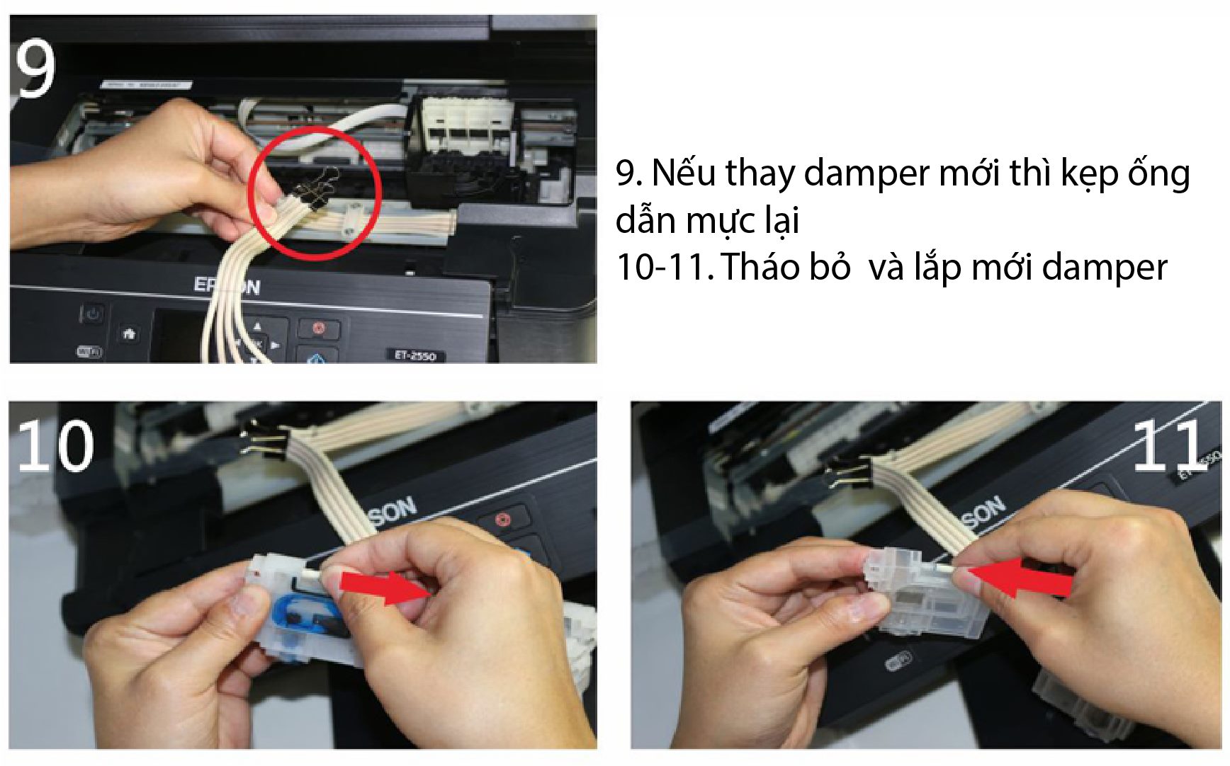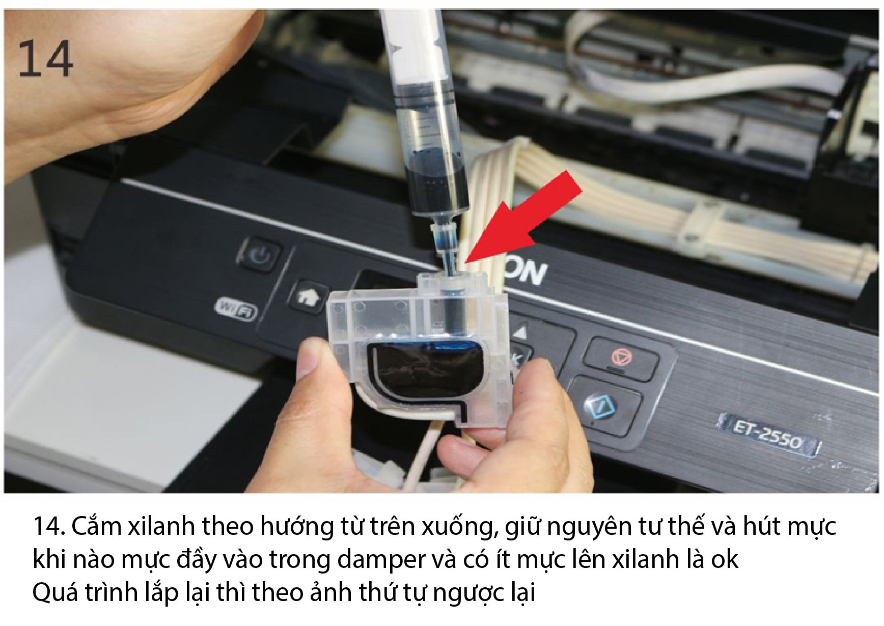 Cách 2. Tháo cụm damper mực ra và hút mực đầy vào damper như hình gắn lại rồi clean nhẹ là ok.