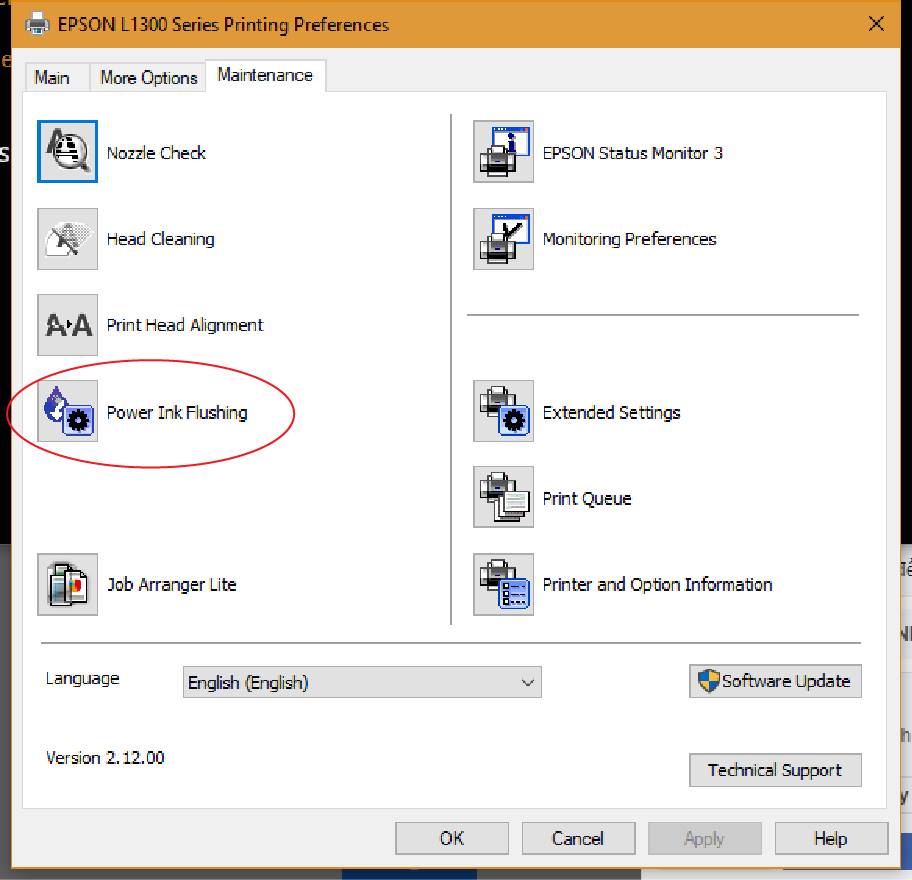 Cách 1. Đổ mực vào đầy bình dẫn mực ngoài và dùng chế độ Power Ink Flushing (ảnh bên dưới) để clean mực, đến khi nào test ra đủ nét thì ok, Dùng cách này thì ko phải tháo máy, nhưng phải clean tốn mực và nhanh phải reset mực thải (mua key reset tốn 100k)
