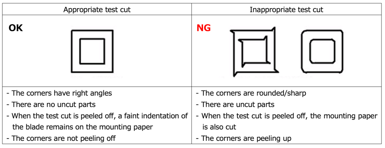 Với hình cắt chuẩn: Các góc sẽ được cắt chuẩn 90 độ, không bị đứt nét, không bị thủng đế decal, các góc không bị bong ra khỏi đế.