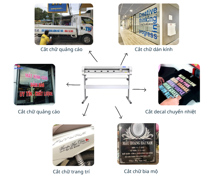 Máy được ứng dụng trong máy cắt decal cho ngành công nghiệp ký hiệu, ngành công nghiệp may mặc, thiết kế và ngành công nghiệp bao bì.