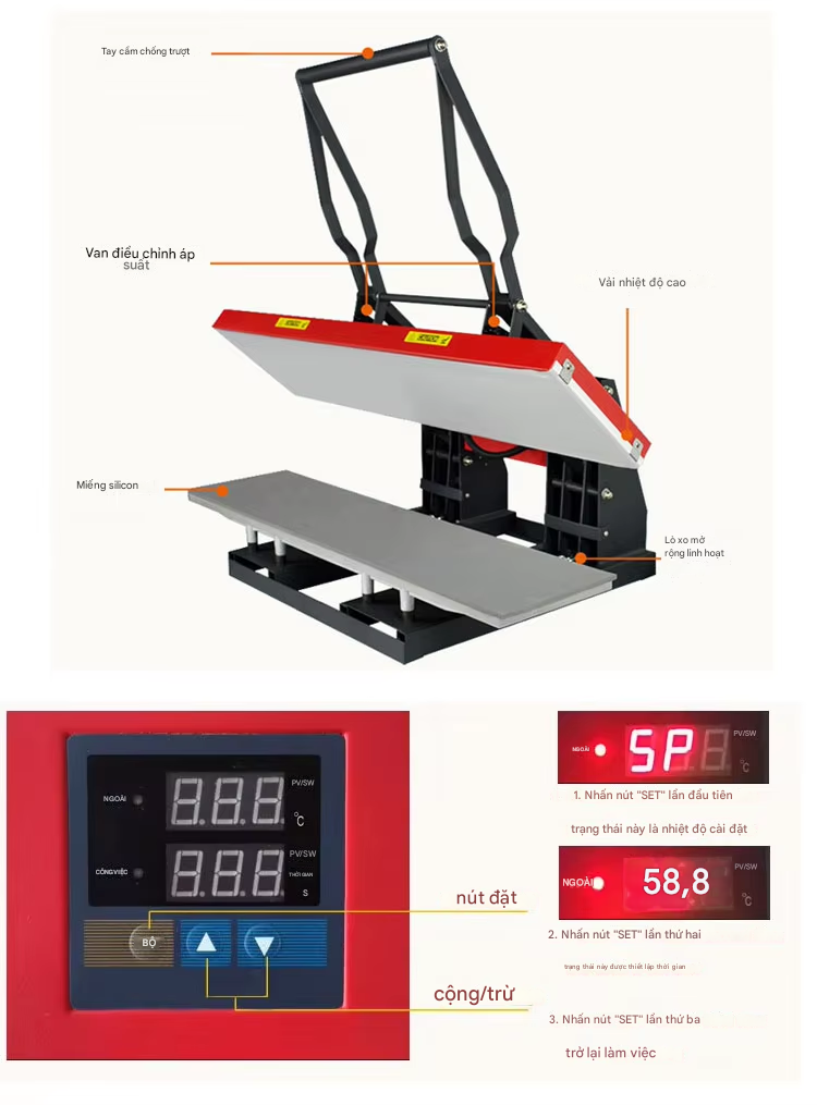 Máy ép nhiệt 25x100cm được trang bị nhiều tính năng vượt trội, giúp nâng cao hiệu suất và trở thành công cụ quan trọng trong bất kỳ cơ sở kinh doanh in ấn nào: