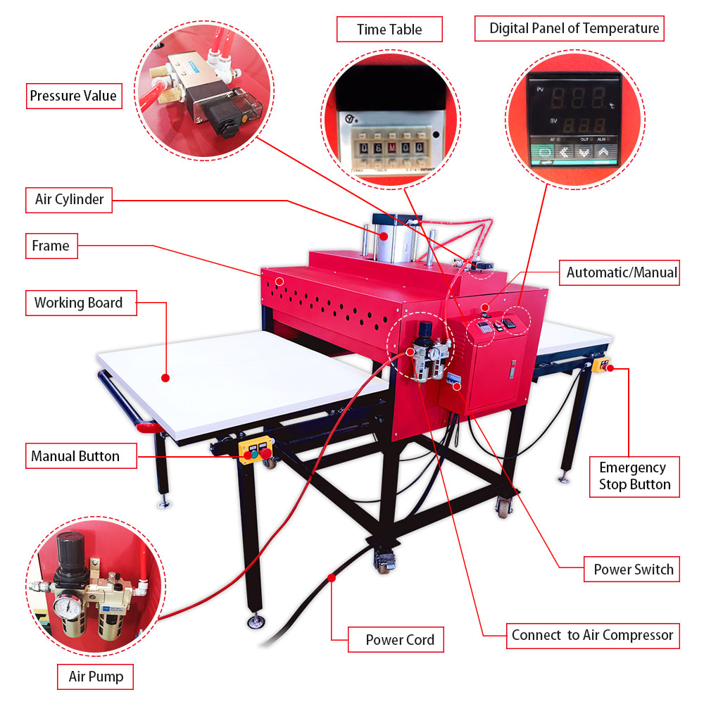 Máy ép nhiệt khí nén khổ 80x100cm đặc biệt phù hợp để in vải khổ lớn, in biển quảng cáo lớn, in hàng may mặc, in gốm sứ, thủy tinh, tấm kim loại, vật liệu xây dựng trang trí, cũng như các loại hình in khác...