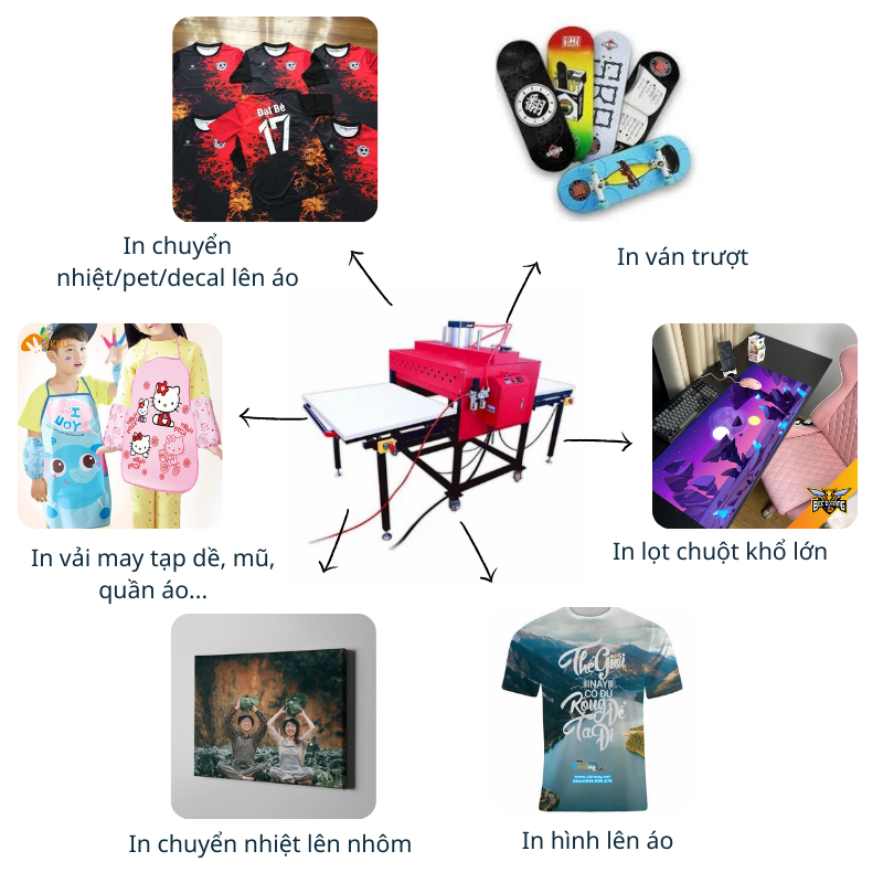 Máy ép nhiệt khổ lớn 80x100cm được thiết kế để in nhiều loại vật liệu. In lên nhiều loại vật liệu bề mặt phẳng như: