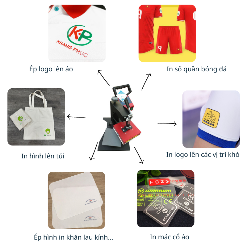 Máy ép nhiệt mini phù hợp cho việc in tên số quần áo thể thao, quần áo bóng đá, in logo decal chuyển nhiệt, logo vải, logo thương hiệu công ty lên áo nhân viên, in decal chuyển nhiệt, ép các hình chuyển nhiệt lên vải, in ép nhiệt balo, túi xách, in chuyển nhiệt lên mũ nón.. Điện năng tiêu thụ thấp là 1 lợi thế của máy. Máy bảo hành 06 tháng.