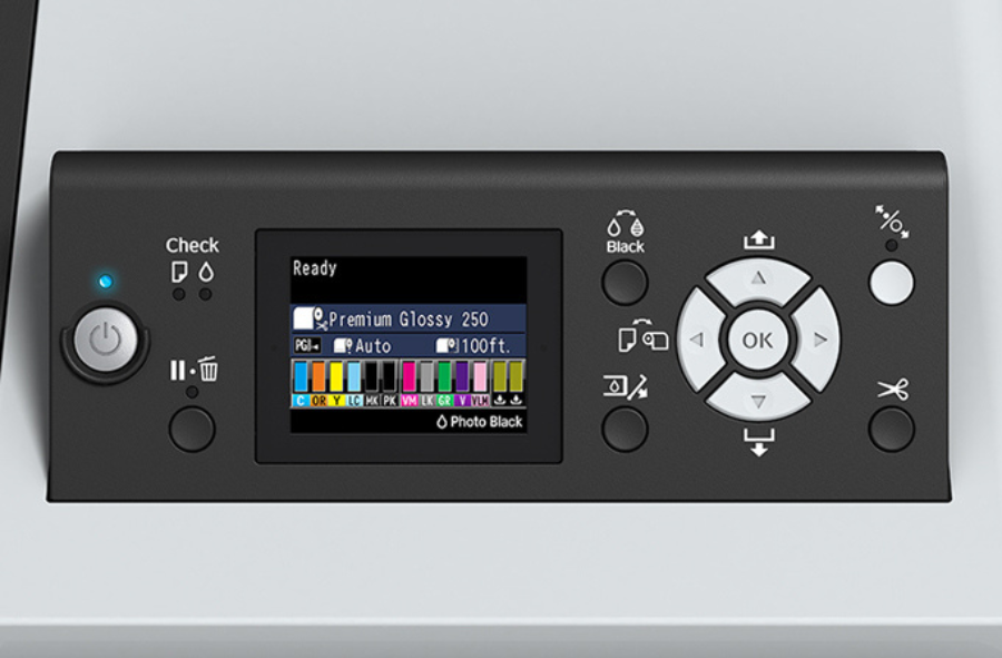Đối với giấy cuộn, máy hỗ trợ tải cuộn rộng 22 và 44 inch, theo dõi độ dài phương tiện cuộn chính xác nhờ công nghệ tự động in và đọc mã vạch để ước tính chính xác độ dài còn lại. Máy sẽ thông báo đến người vận hành nếu không còn đủ giấy in. Công nghệ Epson ePlaten™: Tải và xử lý phương tiện tự động có độ chính xác cao cũng như hỗ trợ phương tiện cuộn nhanh, không trục xoay để giảm nguy cơ hư hỏng phương tiện. Ngoài ra máy có khả năng cắt mượt mà tất cả các loại phương tiện ảnh và mỹ thuật.