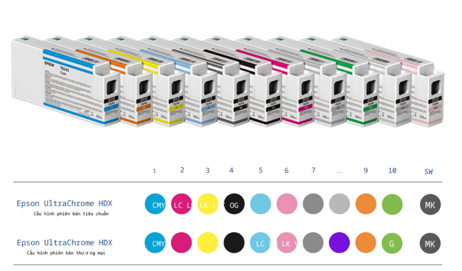 Mực bột màu Epson "Living Color HDX" Cấu hình mực: C, LC, VM, VLM, Y, LK, V, O, G và PK/MK |