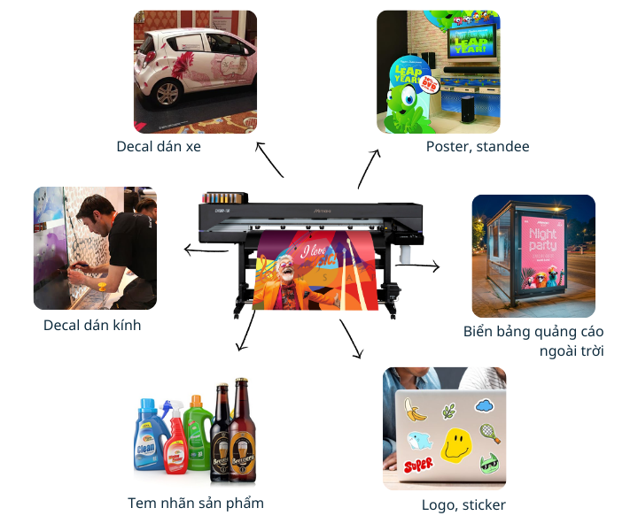 Máy in – cắt tích hợp Mimaki CJV200-130 là giải pháp lý tưởng cho nhiều lĩnh vực in ấn và quảng cáo. Với khả năng in màu chất lượng cao đi kèm chức năng cắt bế chính xác, dòng máy in decal khổ lớn này phù hợp với các ứng dụng như: