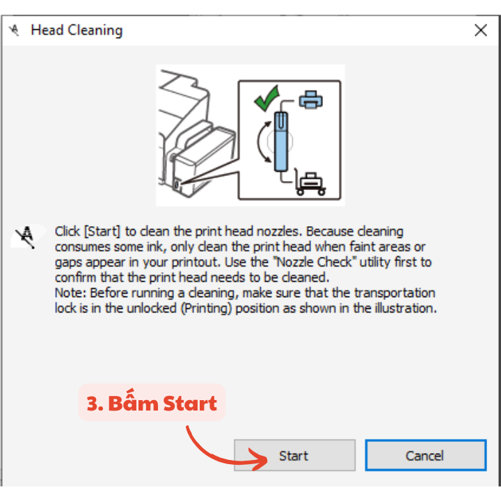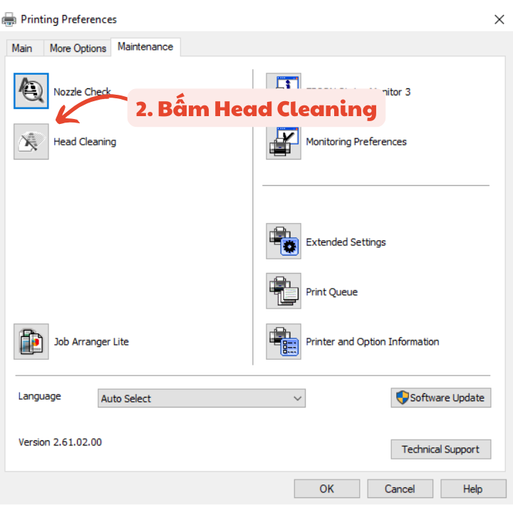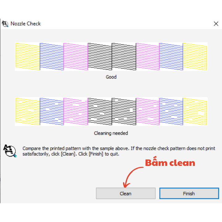 Làm sạch đầu phun là quá trình máy in nạp mực mới lên đầu phun, và đẩy mực cũ ra ngoài (gọi là mực thải). Thao tác này có thể khắc phục một số lỗi như có khí trong đường mực, hoặc mực không xuống đầu in. Tuy nhiên, bạn chỉ nên làm sạch đầu phun tối đa 10-15 lần/ngày và nên hạn chế, chỉ clean khi cần thiết. Thao tác clean như sau:
