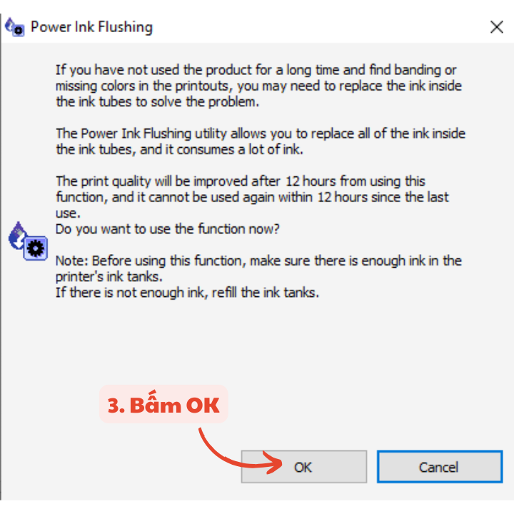 Trong trường hợp bạn để máy in hết mực, mực trong ống dẫn có thể đã hết cạn. Vì vậy, sau khi đổ mực mới bạn cần xả mực. Lưu ý: Thao tác này chỉ được thực hiện 1 lần/ngày. Cách làm như sau: