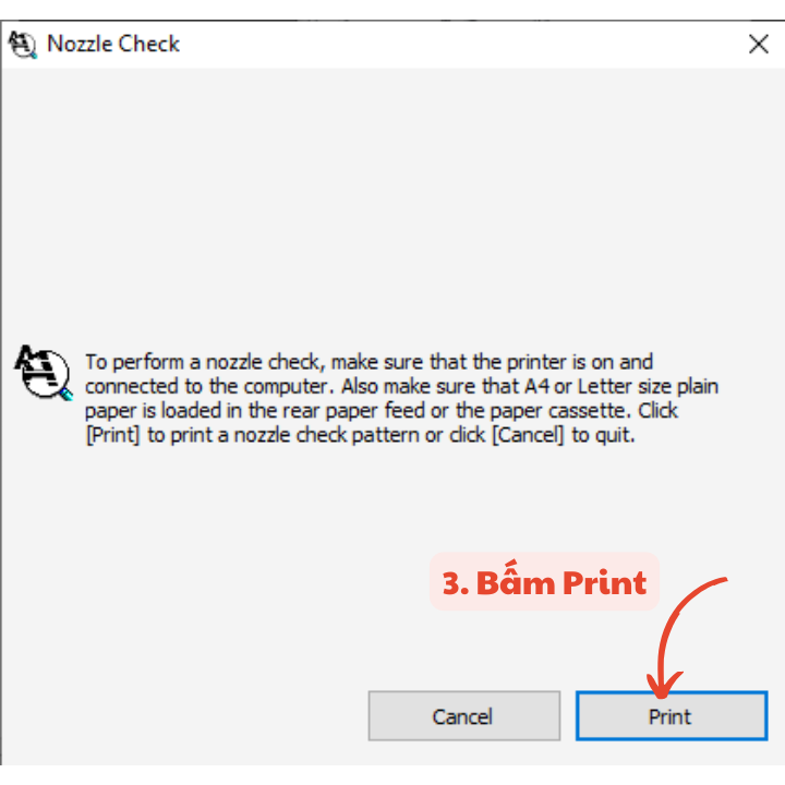 Bấm Print để xác nhận. Lúc này máy in sẽ in ra 1 bản test đầu phun. Có 2 trường hợp xảy ra như sau: