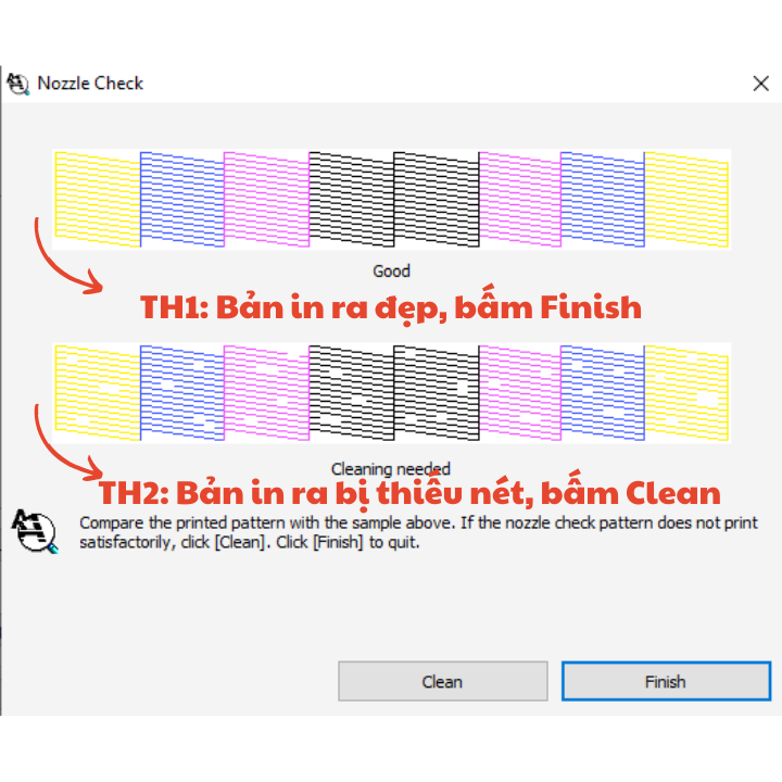 🔍Trường hợp bản in ra bị sọc: Cần kiểm tra bản nozzle check (bản test đầu phun), nếu bản test đầu phun bị thiếu nét thì cần clean lại đầu in.