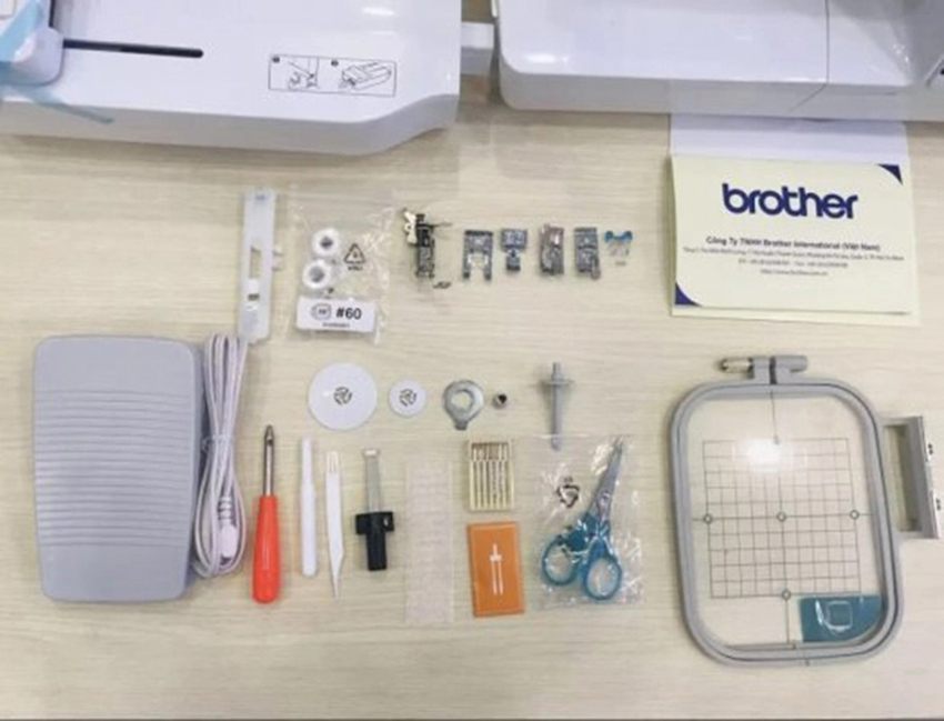 8 chân vịt gồm: chân vịt may đa năng, làm khuy, tra dây kéo, đơm nút, may trang trí, lên lai giấu mũi, vắt sổ, thêu, 4 suốt chỉ; bộ kim may, dụng cụ vệ sinh, bàn đạp điện tử, túi đựng phụ kiện, túi cứng bảo vệ máy, khung thêu ( H10 x W10 cm).