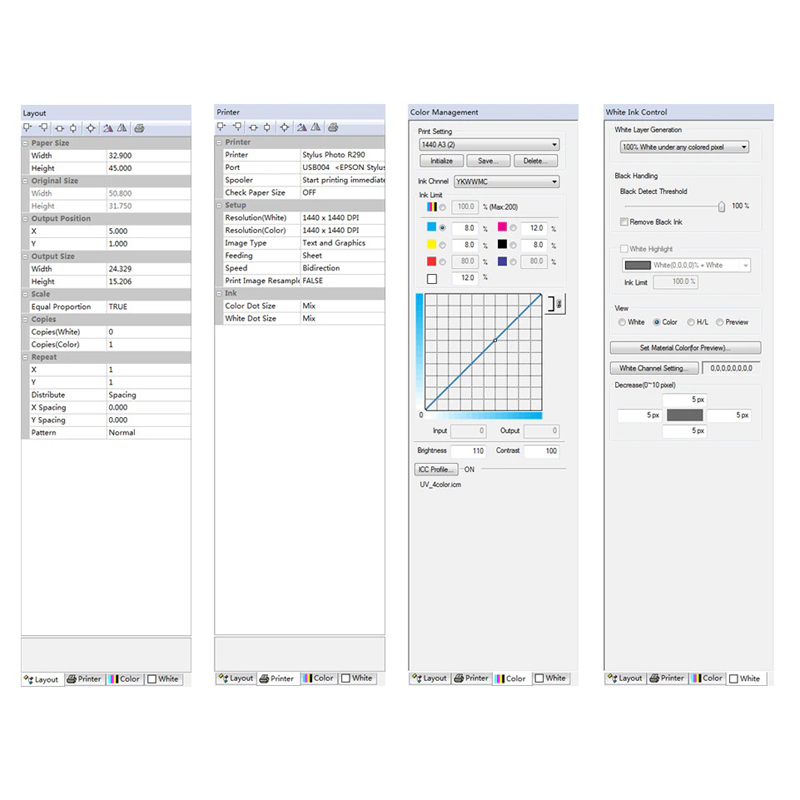 Phần mềm có các chức năng như khóa kênh hoặc thay đổi kênh màu mực máy in. In mực trắng đồng thời với mực màu trong 1 lần in. Điều chỉnh được lượng mực in ra. Có thể điều chỉnh được màu sắc theo ý muốn bằng công cụ ICC Profile trong phần mềm