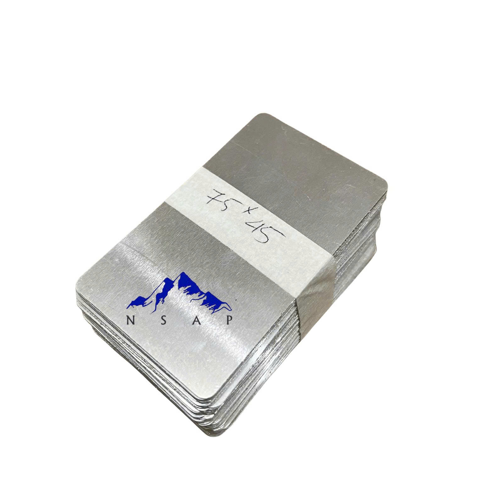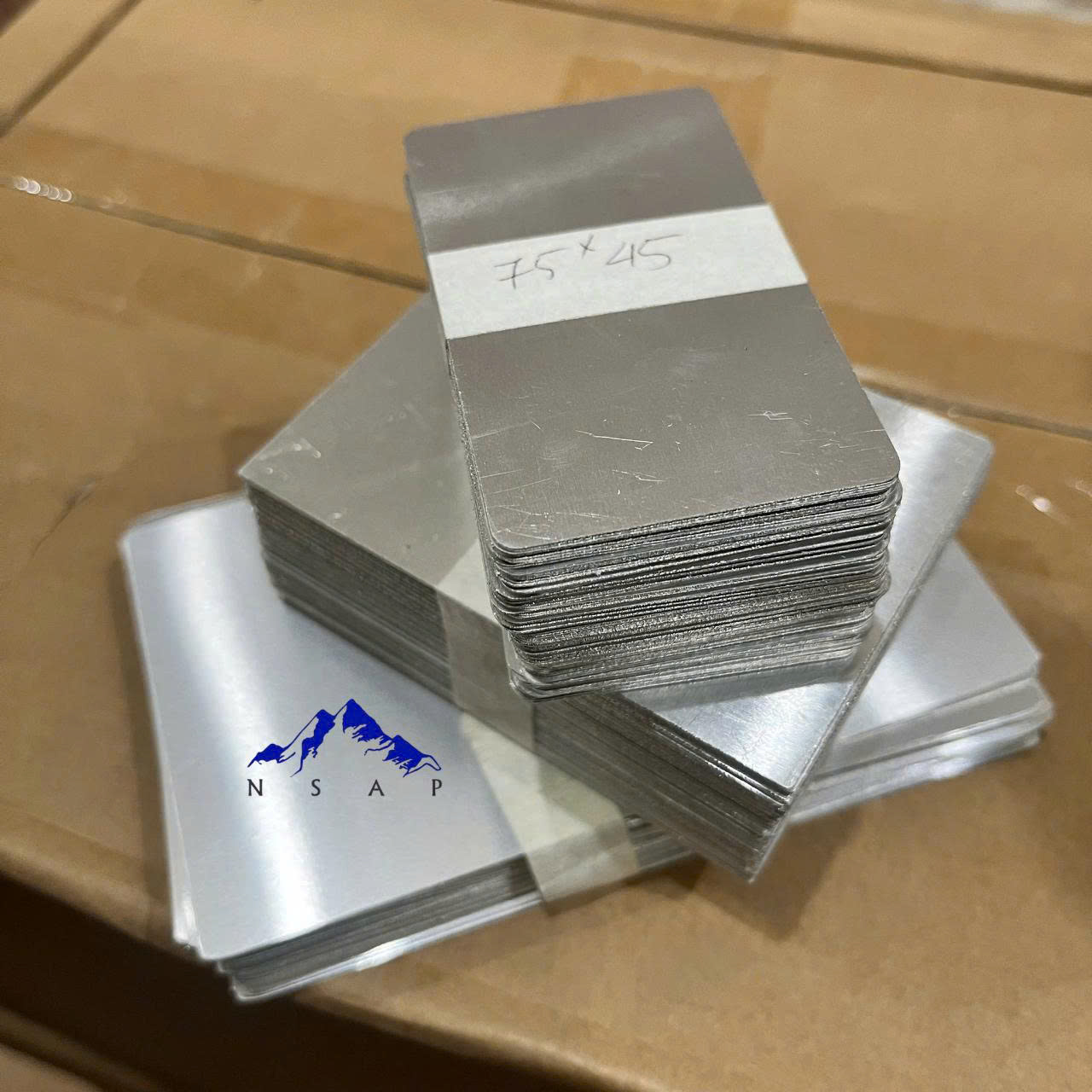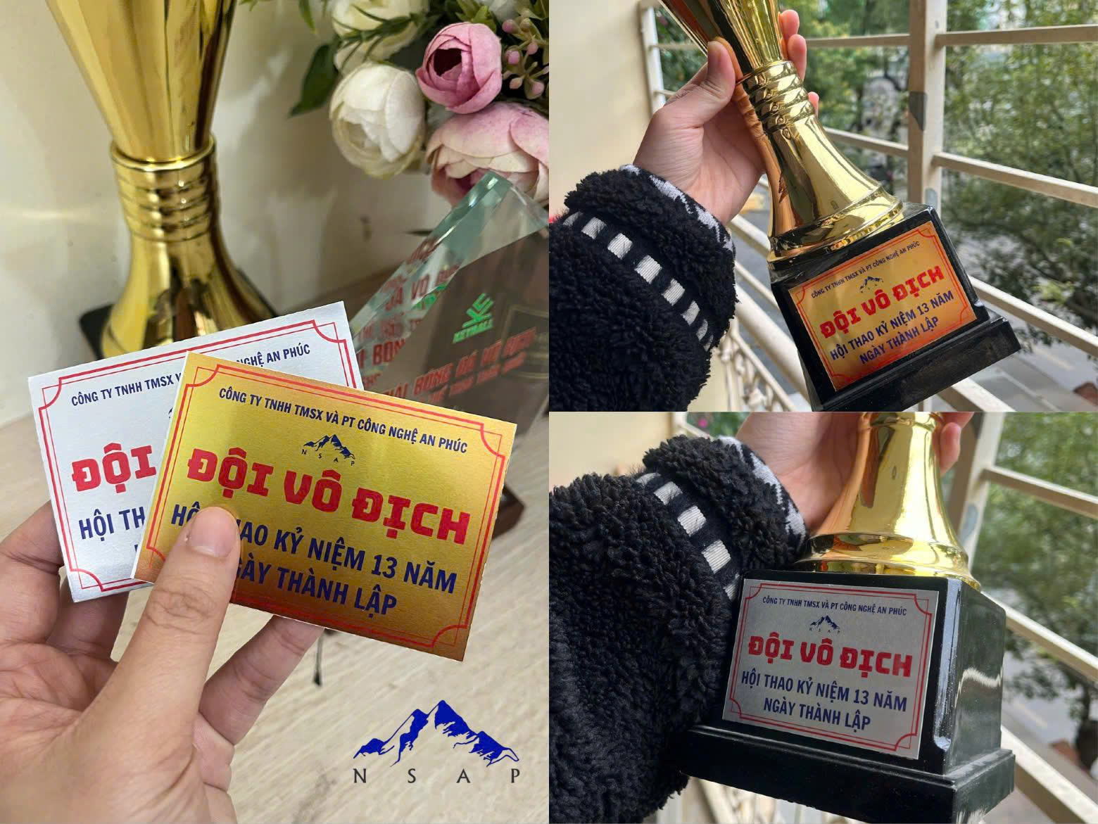 Phôi nhôm được cắt sẵn thành 3 kích thước tiêu chuẩn: 75x45mm, 90x65mm và 135x80mm, phù hợp để gắn lên cúp vinh danh, kỷ niệm chương, bảng trao giải, giúp người dùng tiết kiệm thời gian gia công và đảm bảo tính thẩm mỹ.