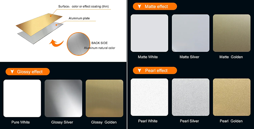 Glossy White, Matte White, Pearl White, Brushed Silver, Mirror Silver, Glossy Silver, Matte Silver, Pearl Silver, Brushed Golden, Mirror Golden, Glossy Golden, Matte Golden, Pearl Golden, Brushed Copper |